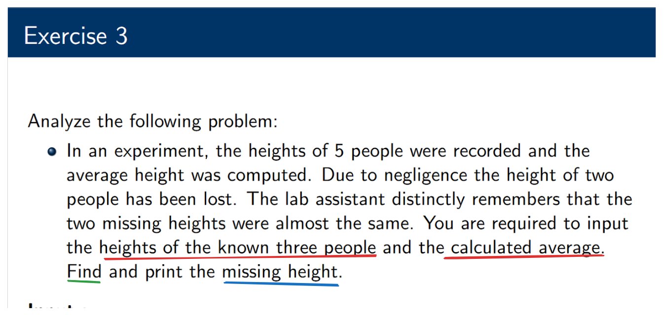Lets look at this one. It says there was an experiment, blah blah blah and we have given the remaining 3 people’s heights and the calculated average. See how those two are required for us to go forward? Those are our input. What we have to find is the missing height. Which is the output, because that’s what we get after we fiddle with the inputs no? So what is find? that is our process. The process of finding the output from the input.